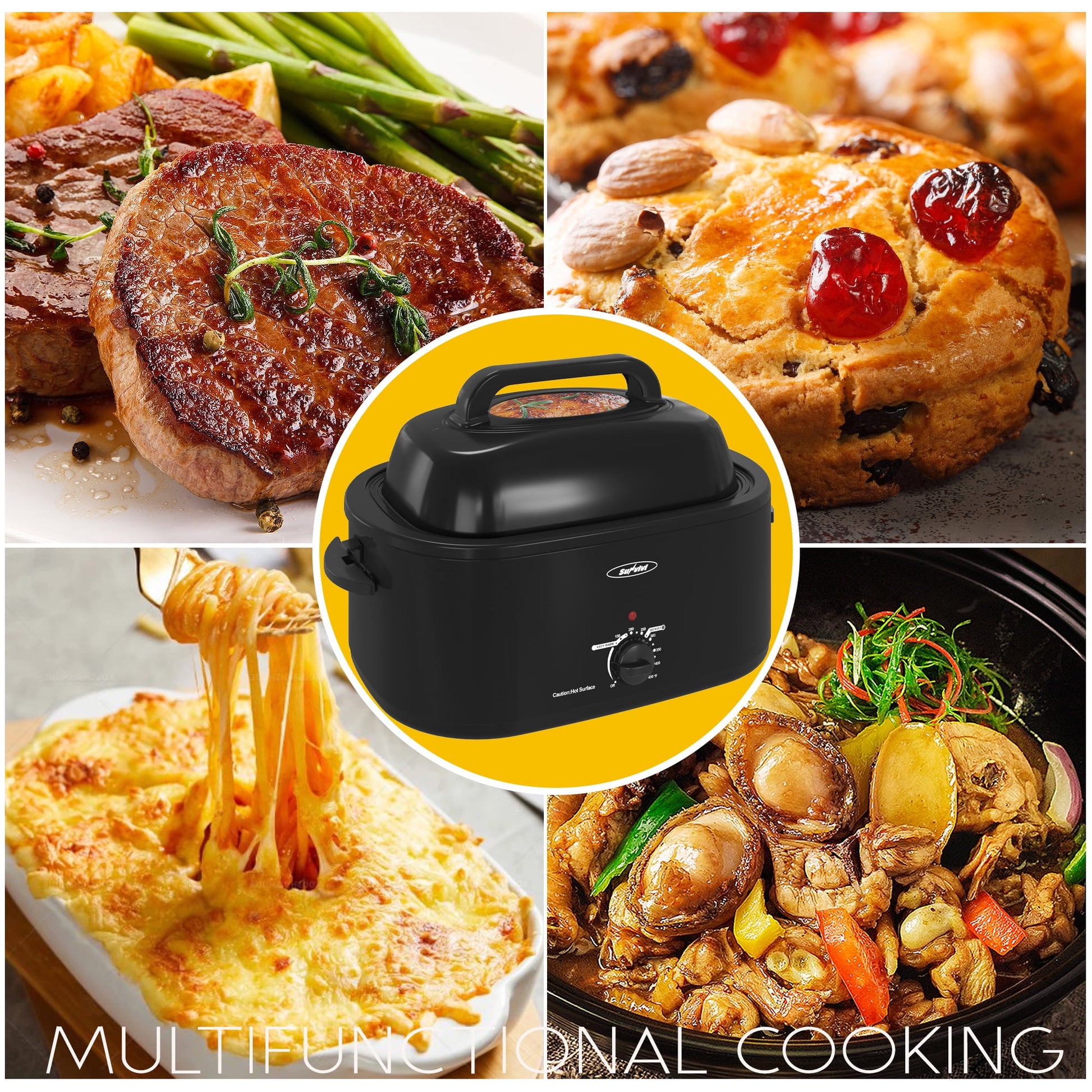 Sunvivi Roaster Oven Equipped with a self-basting lid that continually recirculates moisture, electric roaster oven eliminates the need for hand-basting to help save you time and energy.