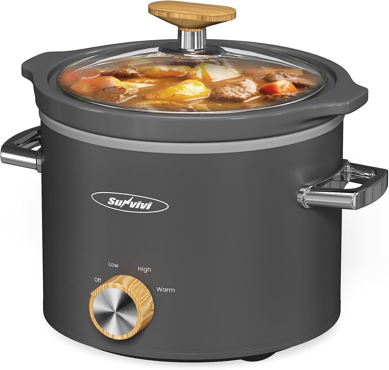Superjoe 2 Quart Slow Cooker, Small Slow Cooker with Removable Ceramic Pot, Slow Cooker Food Warmer with 3 Heating Settings & Dishwasher Safe Glass Lid, Grey