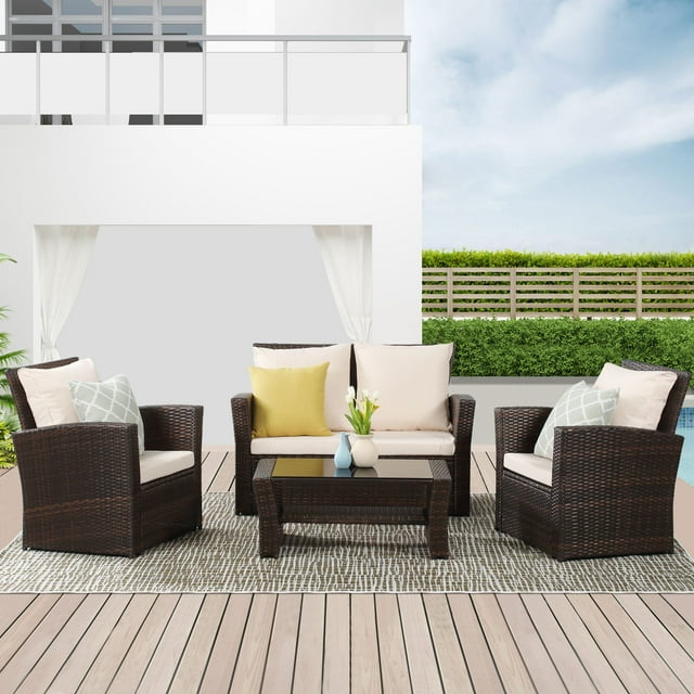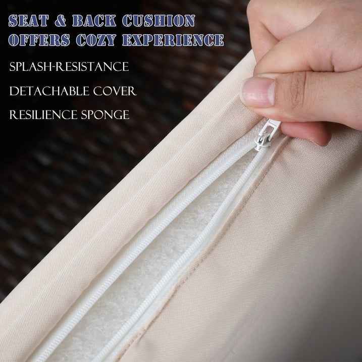 - The weather, rust-resistant 4 piece outdoor set is easy to clean, just hose it down with mild soap. Zipper-designed cushion cover is machine washable. (We suggest it's better to bring the cushions inside during the extreme weather.) Note: The patio furniture set includes 2 separate boxes in total and may deliver at different times.