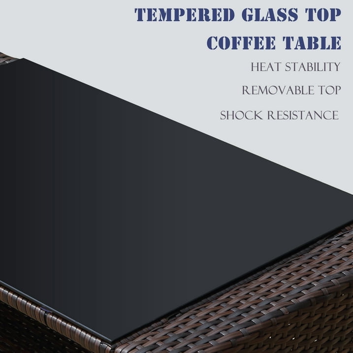 - Water resistant covered cushions along with tempered glass topped coffee table