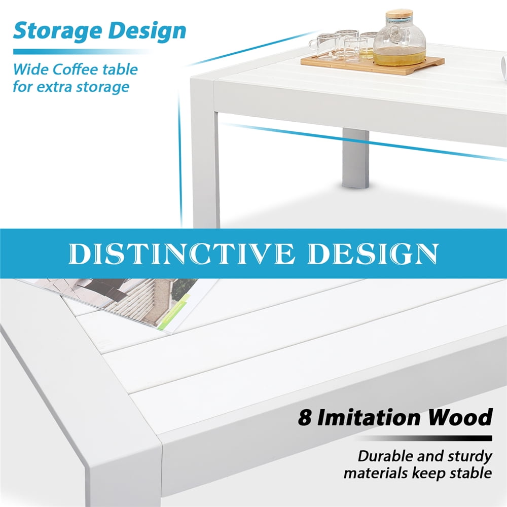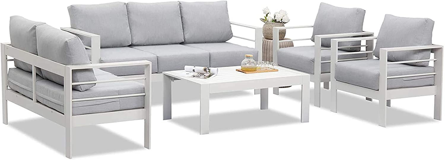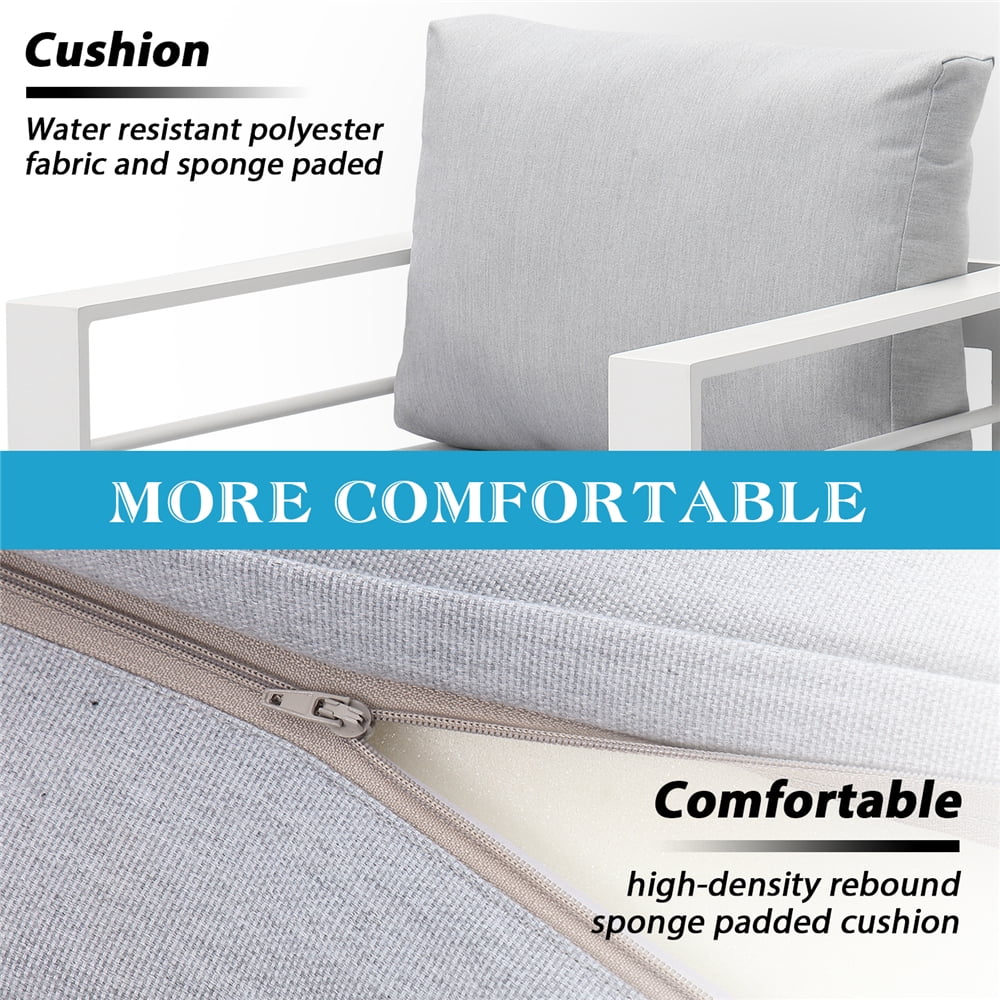 Make your outdoor space more inviting with this cozy 5 pc aluminum conversation set. Our charming patio set will add a dramatic effect,creating a beautiful and luxurious outdoor living space for you and your guests to enjoy in style.4.7" thick soft cushion reduce stress in sedentary and immerse yourself in a cozy environment.Removable cushion covers allow for easy cleaning and maintenance.This modern sectional sofa set features durable powder-coated aluminum frames provides rust resistance and UV resistant durability for years of enjoyment.Great for chat spaces or creating a cozy nook.The coffee table provide space to place snacks and drinks.With unique eye-catching design,this outdoor sofa set offers fashion style and functionality,suitable for balcony,porch,sunroom,lawn and poolside.
