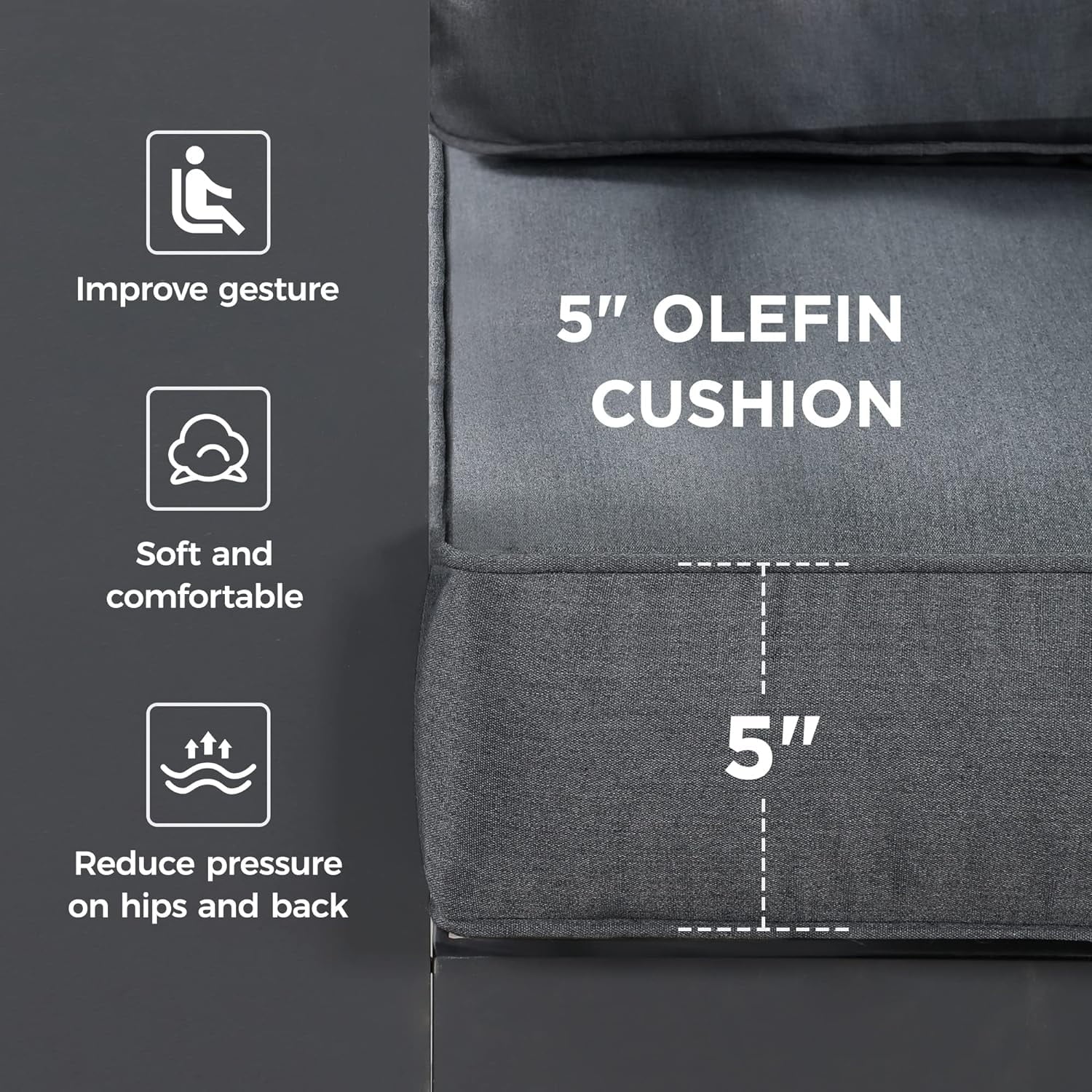 ¡¾5-INCH OLEFIN CUSHION¡¿Covering the top of the outdoor furniture baseplate, the piped cushions provide 5-inch padding as you sit. Thickened at the waist, the foam-filled cushions encourage proper posture while you sit. Each cushion of the outdoor patio set is wrapped in Olefin fabric, so it's sure to stand up to UV rays beaming down when left outdoors.