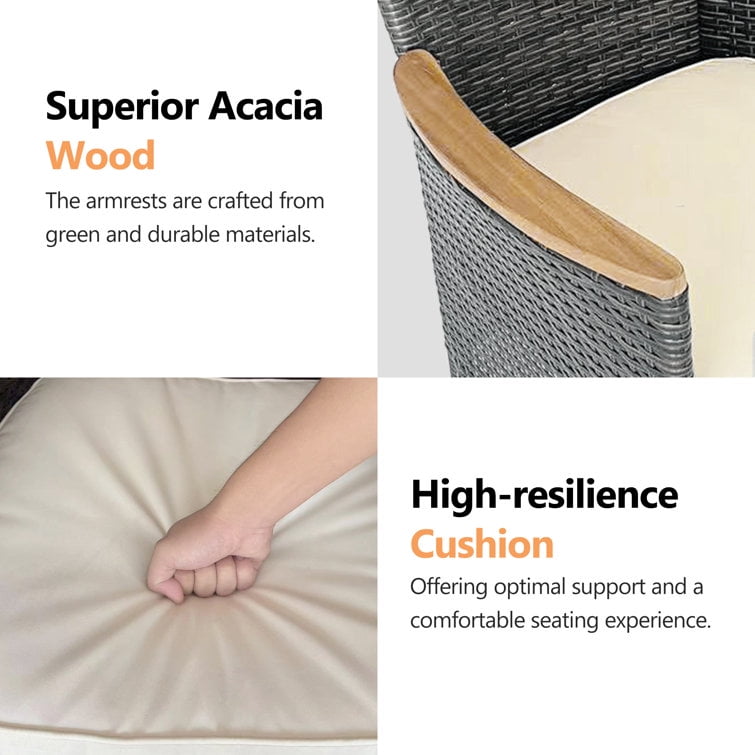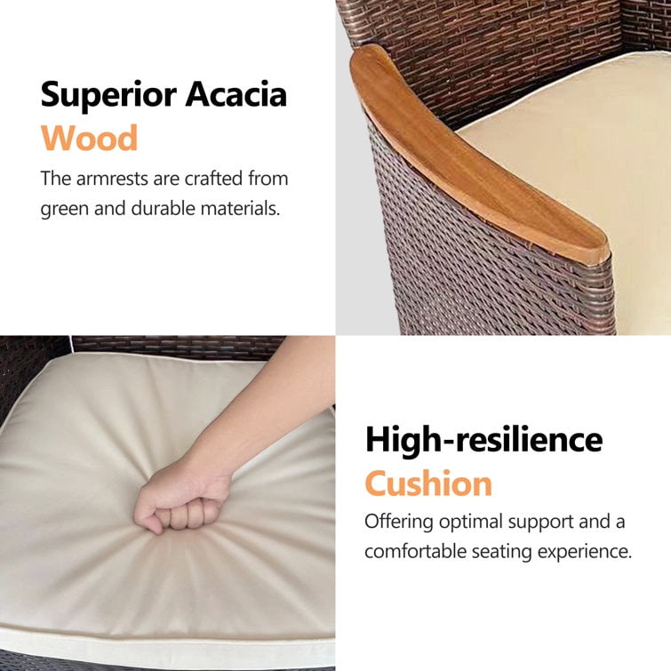 Immerse in outdoor elegance with our finely-crafted dining chair and table set, seamlessly blending aesthetics for a unique natural vibe. Perfect for gatherings or relaxation, it elevates any outdoor space, be it garden, courtyard, terrace, or balcony, adding joy and convenience to your lifestyle. Crafted from premium Acacia wood and brown rattan, the set is waterproof, wear-resistant, and visually appealing. The sturdy steel frame ensures durability and weight capacity for years of use. Equipped with stabilizing feet, both table and chairs offer optimal stability without wobbling. Despite its robust build, the set remains lightweight for easy transport and storage.