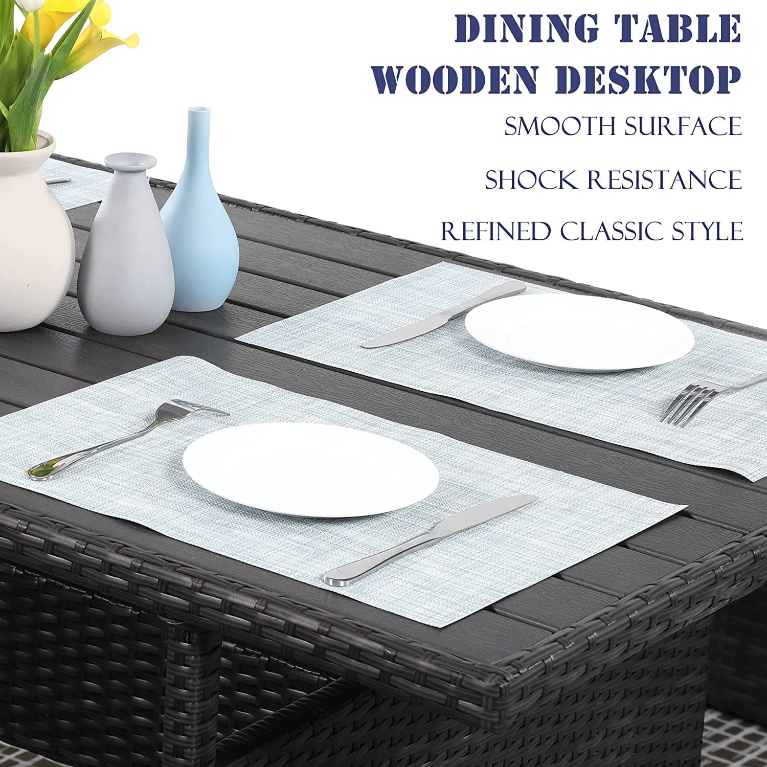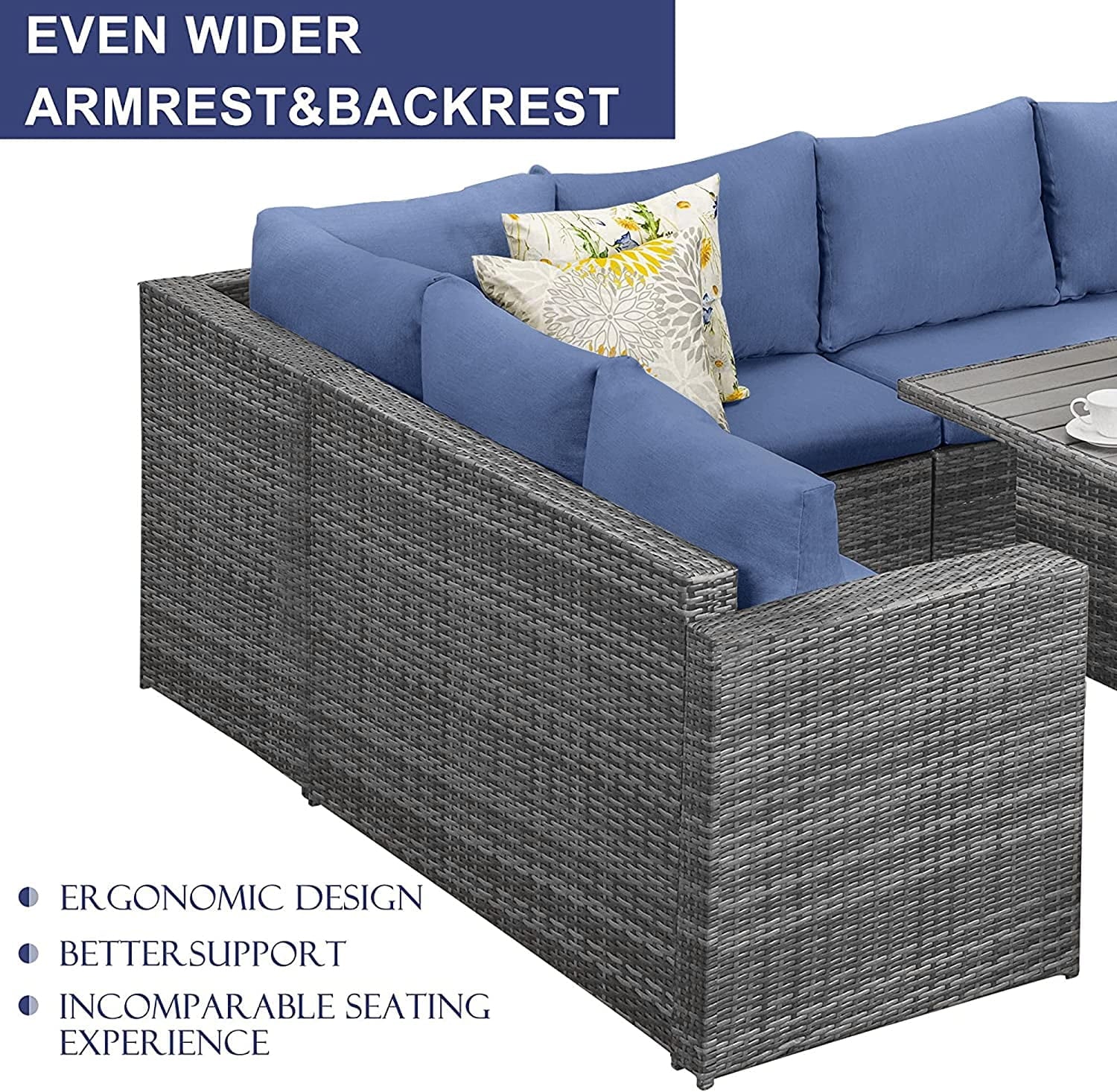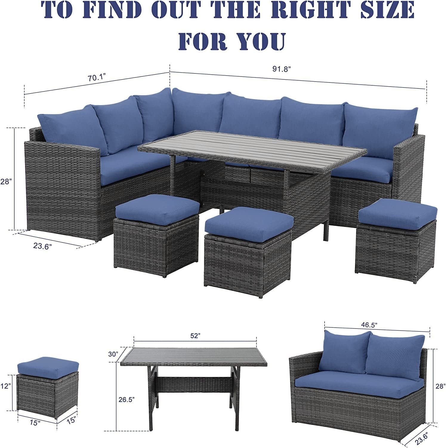 This Heynemo outdoor patio set furniture boasts a timeless design that is elegant yet comfortable and durable.The 7 piece patio furniture set with rectangle dining table is made with high quality steel frame wrapped with weather resistant rattan.It will last for many years for family summertime fun and endless outdoor entertainment occasions.Equipped with thick and high resilience off-white cushions for seat,it is very comfortable.The cushion with hidden zipper is easy to take off and rinse by hand or washing machine.This rattan sectional sofa and dining table can be combined in various ways or be used separately according to your different needs,this outdoor dining table set also makes terrific gift ideas for those who like to enjoy a leisure life.