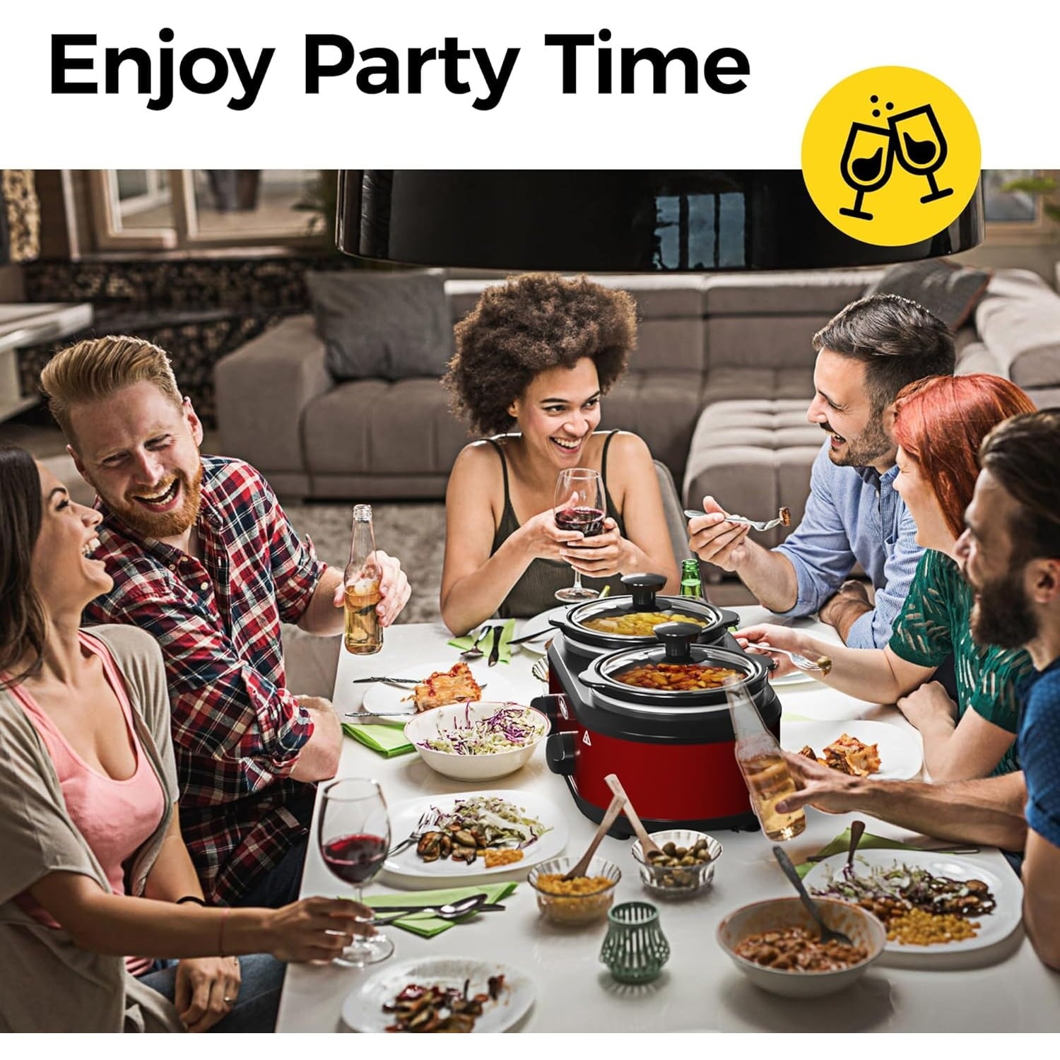 Superjoe Double Slow Cooker,2 Pot Small Mini Crock Buffet Servers and Warmer,Dual Pot Oval Manual Slow Cooker with Adjustable Temp Removable Ceramic Pot,Stainless Steel, Total 2.5 Quarts Red