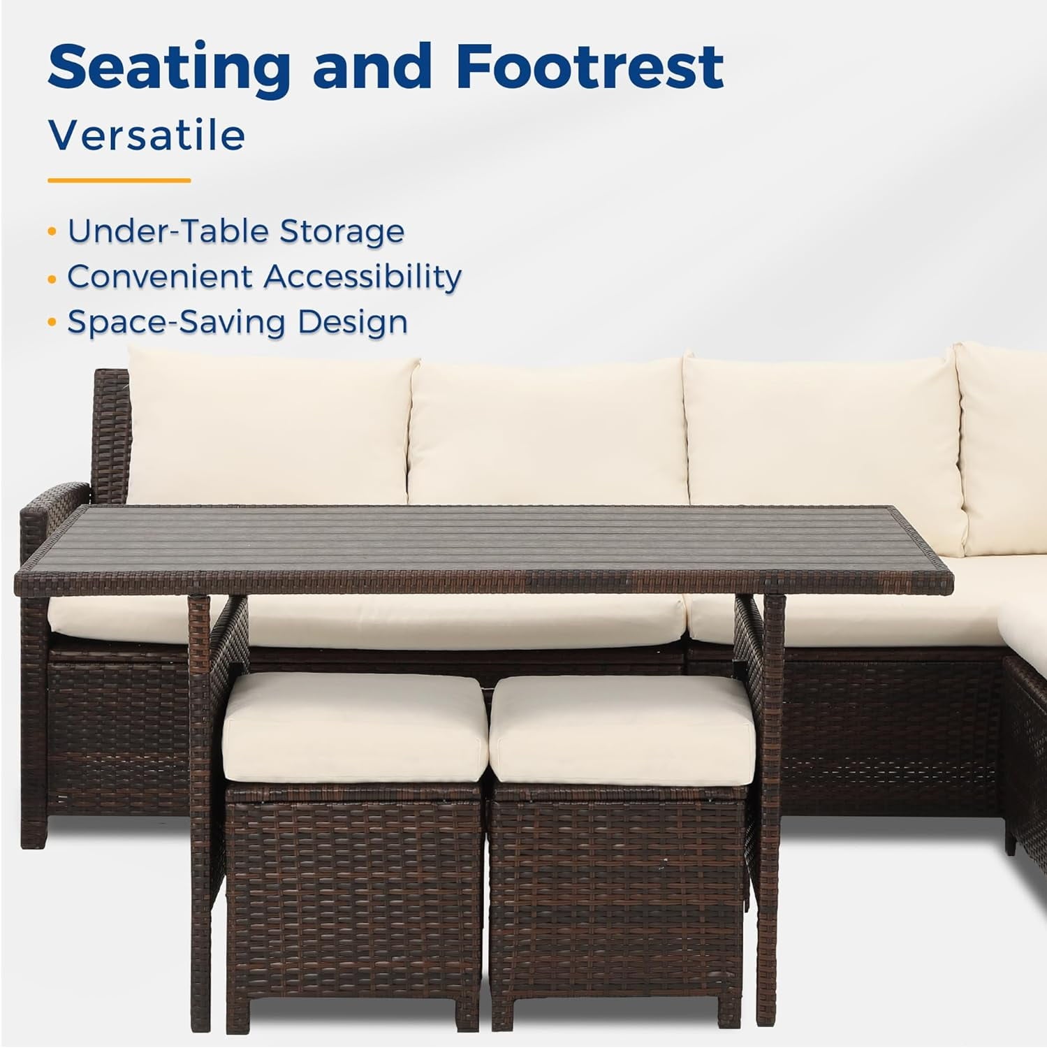 Superjoe High Curved Back 7-Piece Wicker Dining Sectional Sofa with Dining Table and Chair, Ivory
