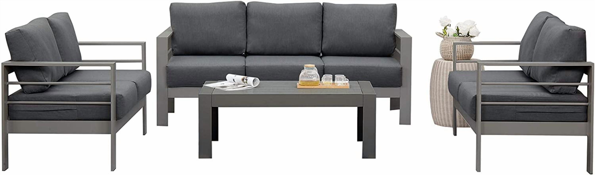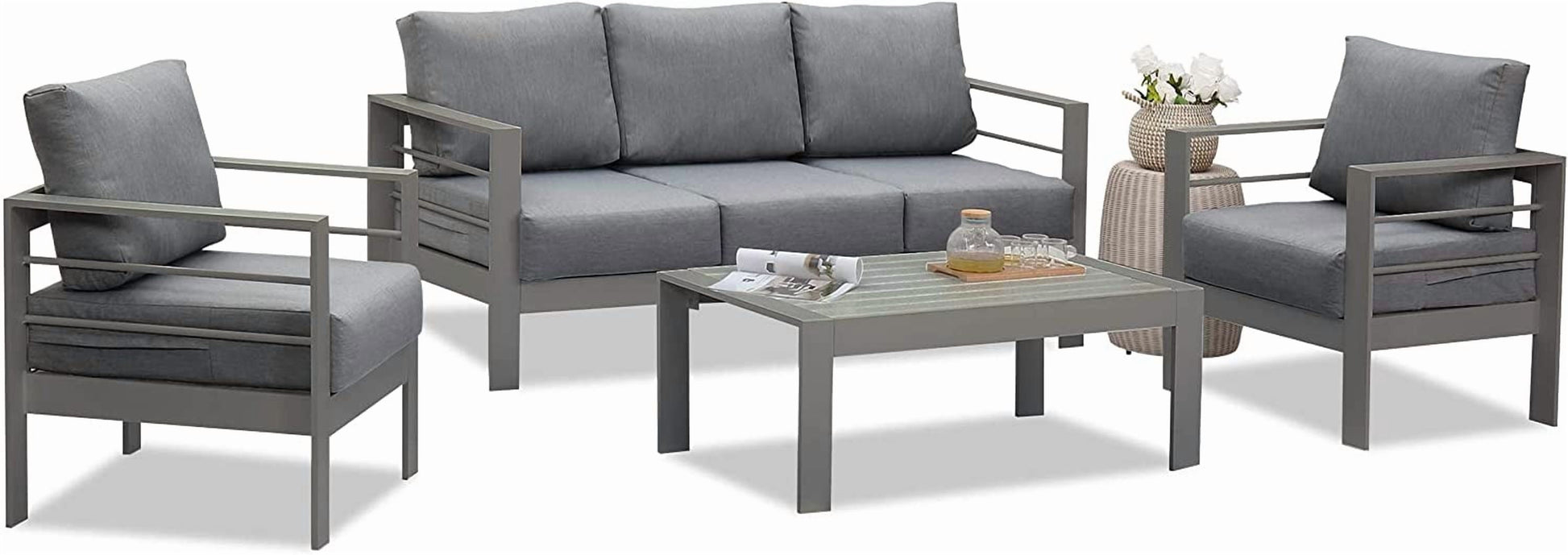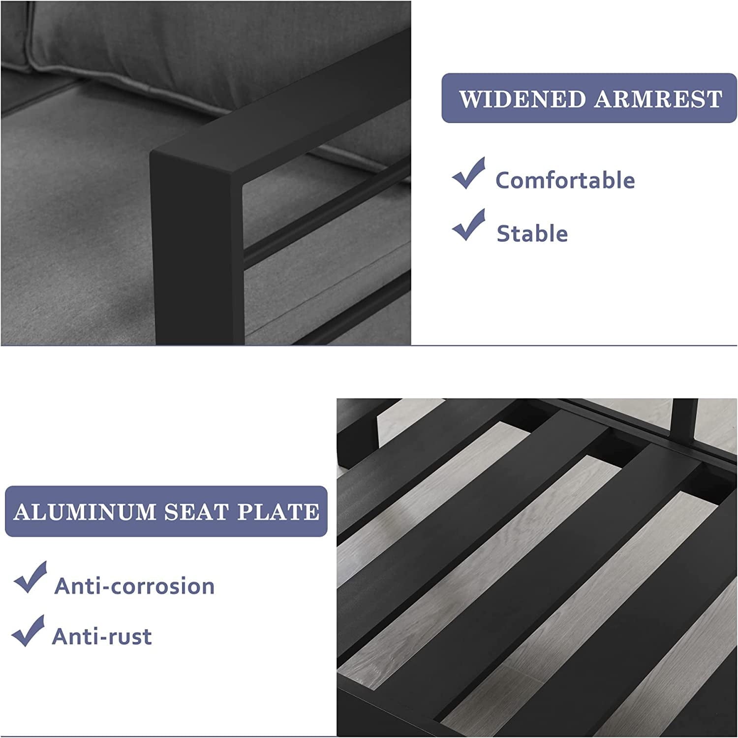 - Crafted from fully seam welded and rust-proof screws, which gives the modern aluminum outdoor patio furniture flexible, impact-, and crack-resistant qualities. Durable welds and strong screws give our loveseat a solid frame and sturdy feel. Plus, the 4 aluminum legs are protected by plastic feet to prevent abrasion and sharp scrapes.