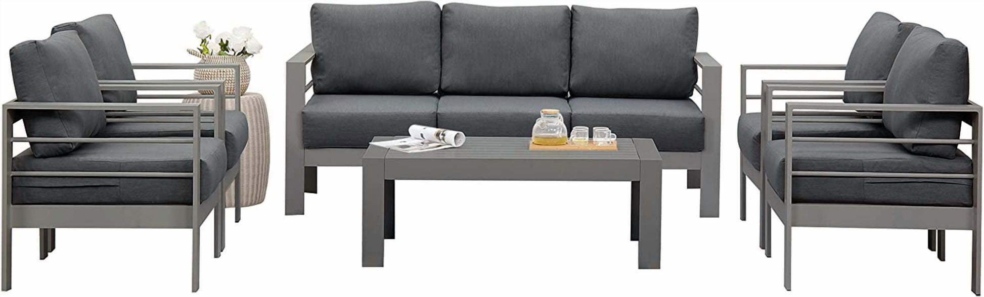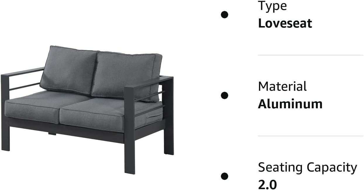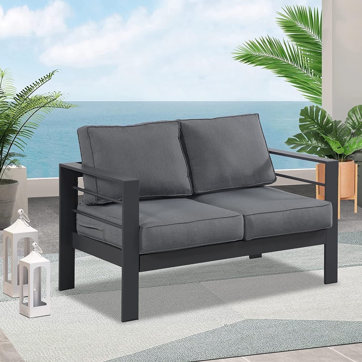 - Covering the top of the aluminum outdoor sofa baseplate, piped cushions provide 5-INCH padding as you sit. Thickened at the waist, the foam-filled cushions encourage proper posture while you sit. Each cushion of the patio furniture loveseat is wrapped in water-repellent OLEFIN fabric, so it's sure to stand up to UV rays beaming down when left outdoors.