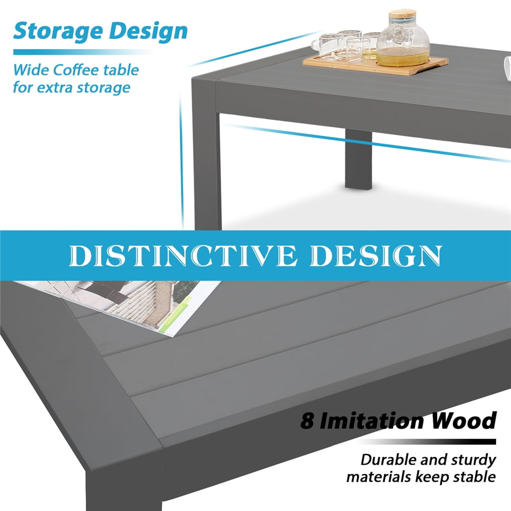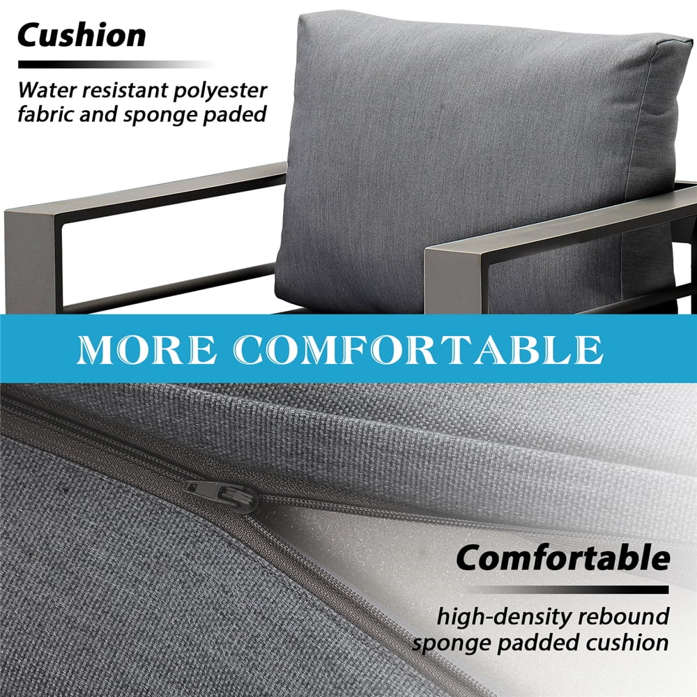 We're committed to creating useful products backed by friendly, responsive service to delight our loyal customers around the world. This elegant style of this 4-seats patio set enhances your patio or backyard. Charming conversation set adds a dramatic effect to the set, creating a beautiful and luxurious outdoor living space for you and your guests to enjoy in style.4.7" thick soft cushion reduce stress in sedentary and immerse yourself in a cozy environment. Removable cushion covers allow for easy cleaning and maintenance.This modern sectional sofa set features durable powder-coated aluminum frames provides rust resistance and UV resistant durability for years of enjoyment.Great for chat spaces or creating a cozy nook.The coffee table provide space to place snacks and drinks.With unique eye-catching design. This set offers fashion style and functionality to you and your friends. Suitable for balcony,porch,sunroom,lawn and poolside.
