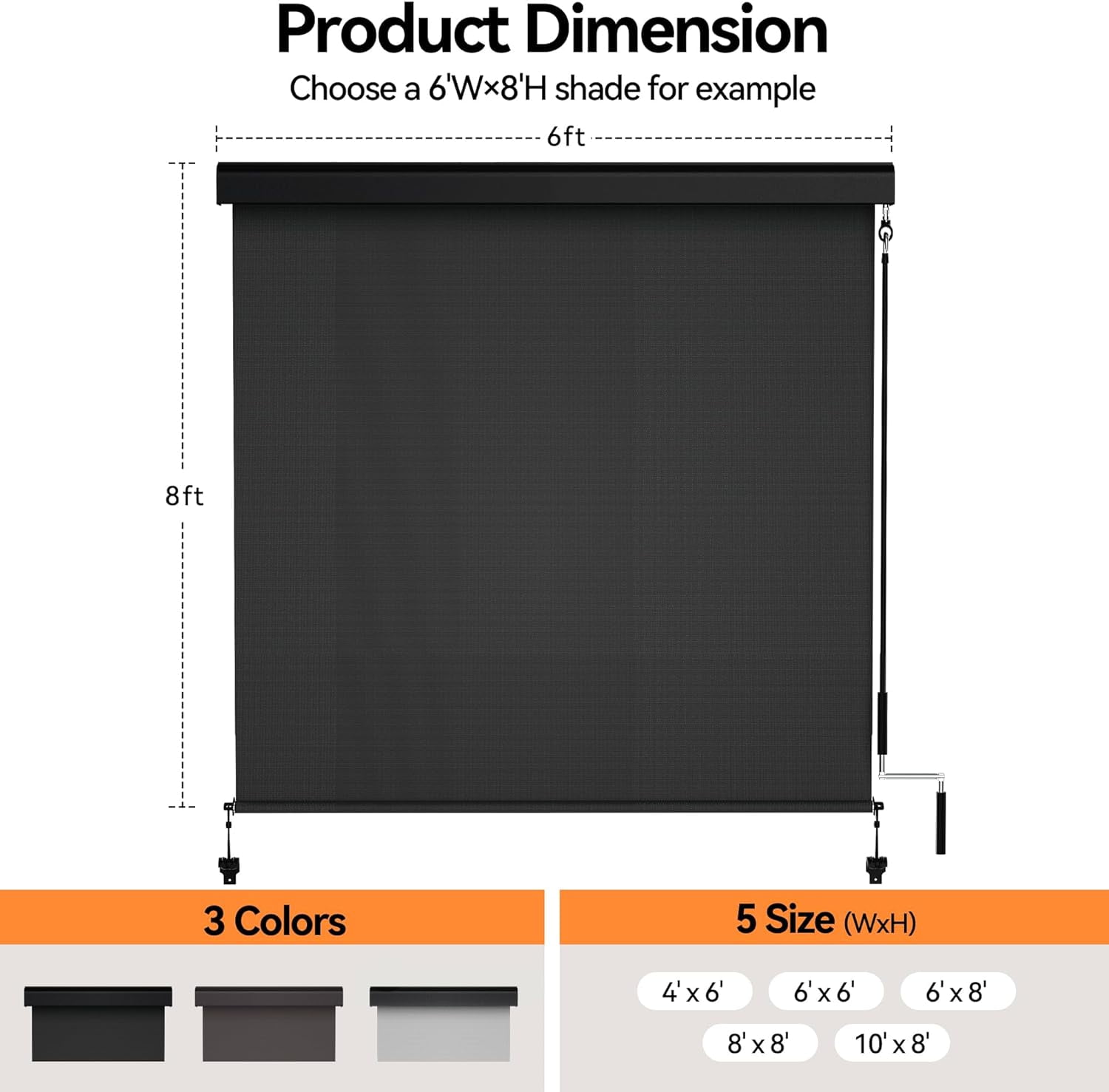 Superjoe Outdoor Roller Shades with 95% UV Blockout, 8'L x 8'W Exterior Cordless Patio Shades Roll Up Outdoor Blinds for Porch Gazebo, Blockout Waterproof Protect Privacy, Black