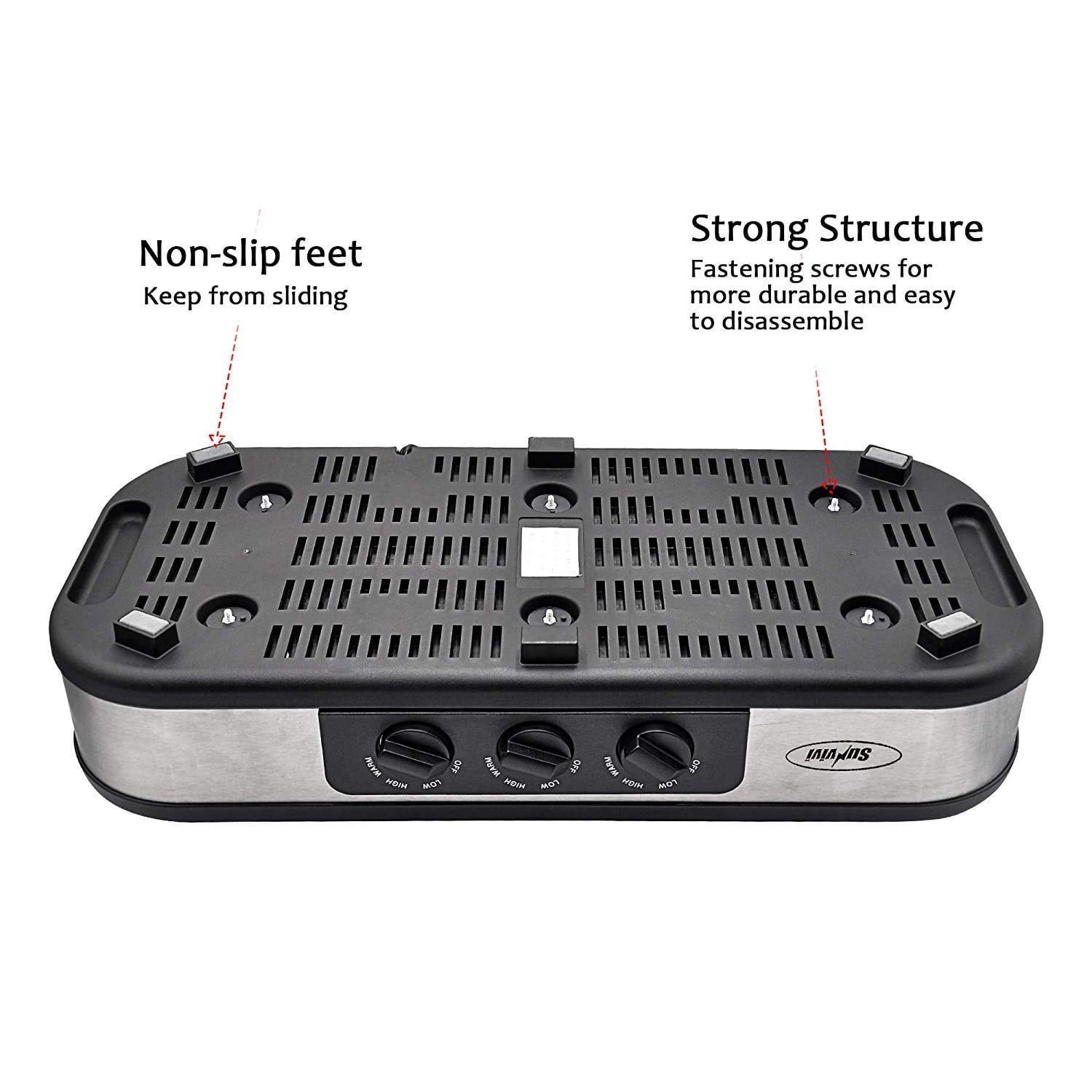 Sunvivi beautiful stainless steel Triple Slow Cooker Buffet Server will keep food warm, fresh, and delicious at any time. This kind of Electric Slow cook can cook three different dishes directly on the server and keep food warm for hours. It is ideal for office parties, family functions, and other social events. Three 1.5 Quart Ceramic Pots: There are 3 separate ceramic pots, you can cook 3 separate dishes at the same time. And the pots are removable, it is easy for cleaning. With this triple slow cooker, it will help you save much time on holidays and parties. Each slow cooker is a 1.5 Quart capacity that equals a total of 4.5 Quarts. Three Cooking Settings: There are 3 cook settings: Low, High, and Warm, giving you the flexibility to cook whatever you want and keep food warm for hours, ensuring your food is cooked in the best cooking condition. And each cooker has its own individual controls to adjust the temperature for cooking and keep warm. Three Glass Lid Rests: Lid with locking system rests to food spillover and transparent heat-resistant glass cover is easy for viewing. Letting you know at any time how much your food has been cooked. Non-skid rubber feet keep the slow cooker in place safely and conveniently for cord storage. Anti-scald and cool-touch handles on the lid can protect your hands. Specification: Power: 300W. Working Voltage: 120V. Working Frequency: 60Hz. Capacity: 3x1.5 Quart. Material: Stainless Steel & Glass & Food Grade Stoneware Pot. Color: Silver & Black.