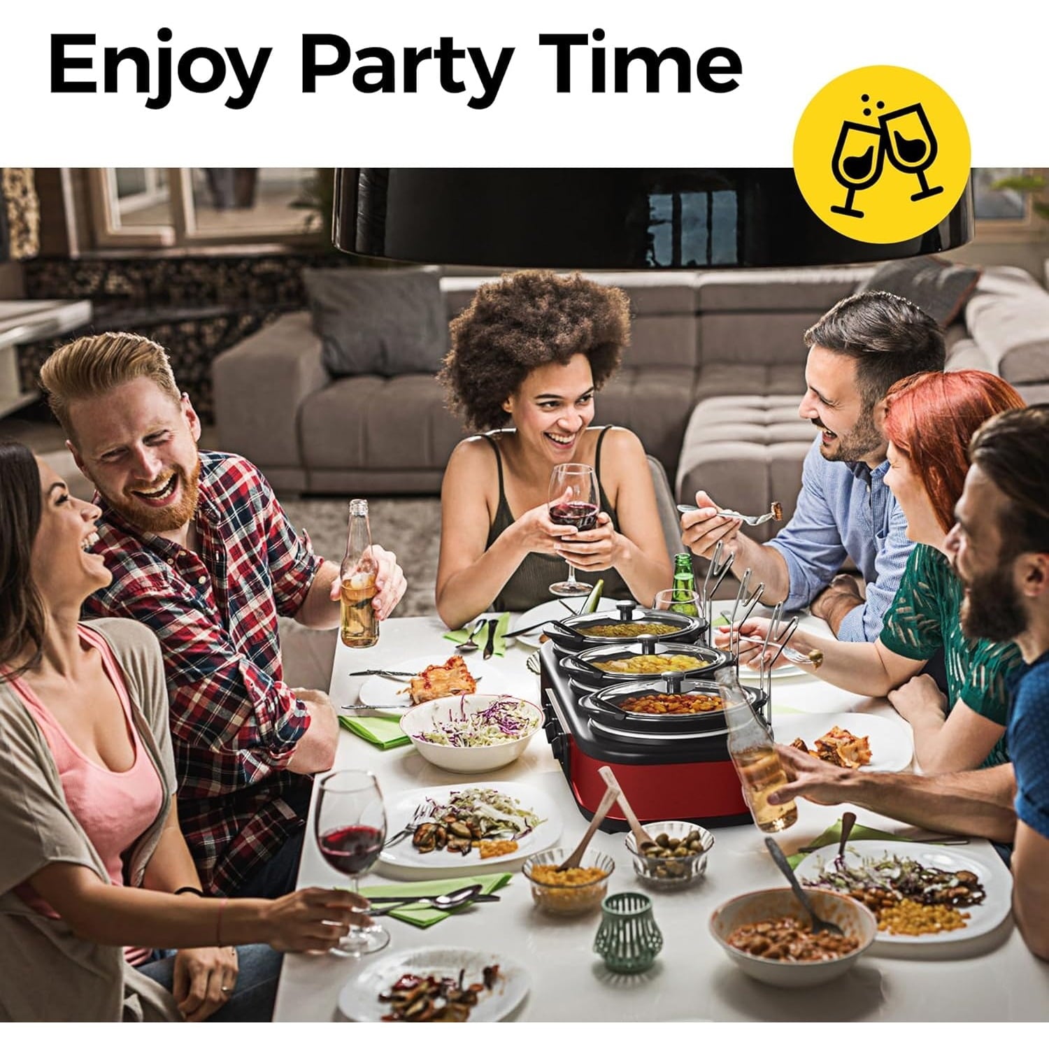 Introducing our Sunvivi Electric Triple Slow Cooker - the ultimate kitchen companion for those seeking versatility and convenience. If you're looking to upgrade your cooking techniques or need a reliable appliance to handle multiple tasks, look no further. Our Triple Slow Cooker is a powerhouse that excels at boiling, roasting, steaming, and more. With its adjustable cooking temperature, you can achieve the perfect results every time by simply rotating the control button. Say goodbye to cold food with the "WARM" setting that keeps your dishes at an ideal serving temperature even after a busy day in the kitchen. What sets this slow cooker apart is its three separate 1.5QT pots, allowing you to cater to different cooking needs simultaneously. This makes it an excellent choice for parties, where diverse tastes can be easily accommodated. Specification: Dimensions: 22.1"(L) x 9.6"(W) x 4.3"(H) Temperature settings: Low, High, Warm Lid material: Glass Capacity: 3x1.5 Quart Color: Silver & Black& Red & Copper Includes 3 pots and 3 spoons