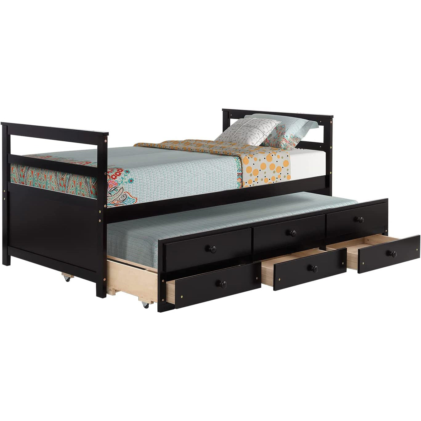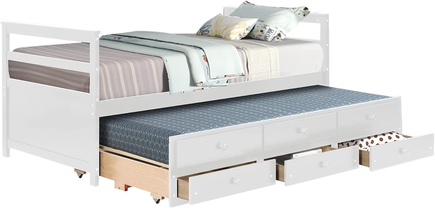 Twin Bed with Trundle and 3 Storage Drawers, Captain Bed Frame with Headboard and Footboard
