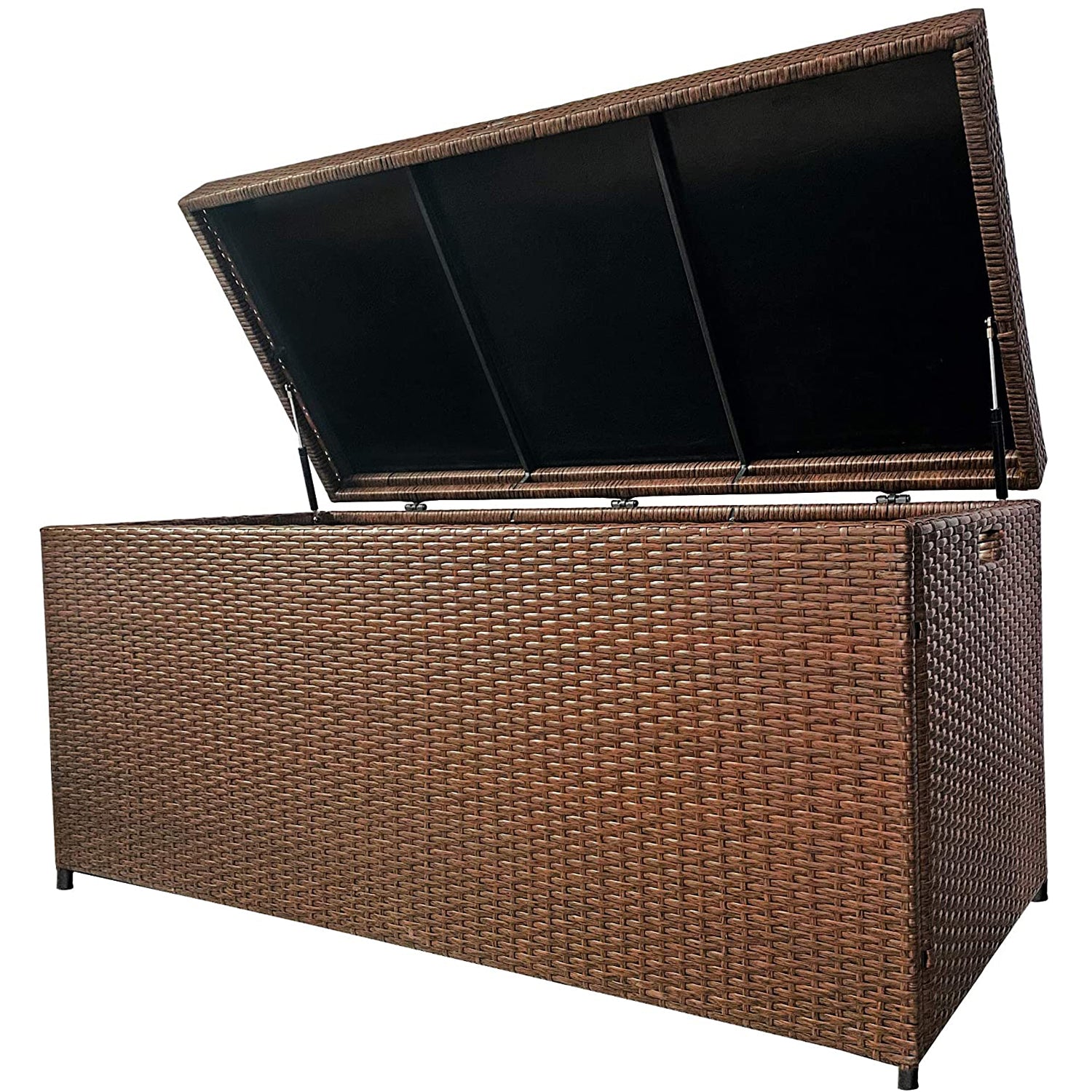 DURABLE AND SAFE Wicker storage box is constructed from aluminum frame and brown hand-woven PE rattan wicker, feature durable, rust-resistant for years of use. And The cover connection adopts pneumatic rod design to protect you and your family during use.